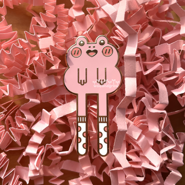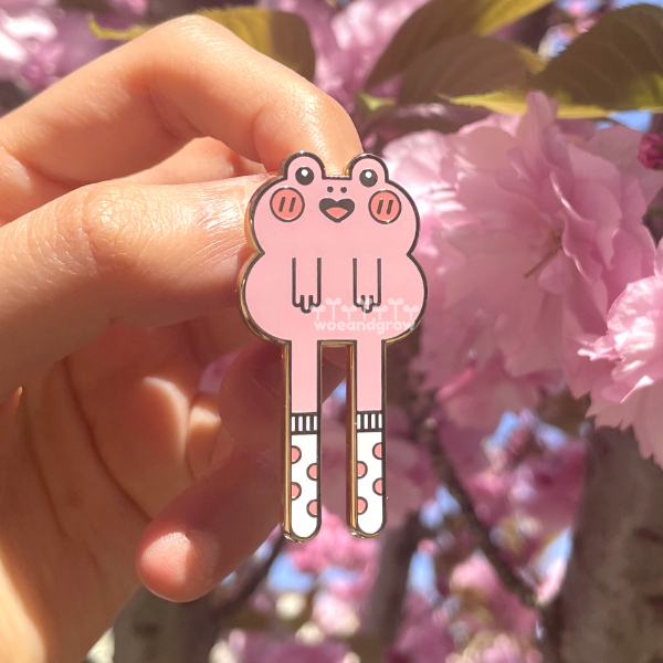 This adorable fashionable pink froggie pin was originally part of the 'Frogs with Socks' enamel pin collection on Kickstarter. Enjoy your very own froggie friend sporting polka dot socks and a big smile.