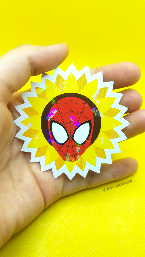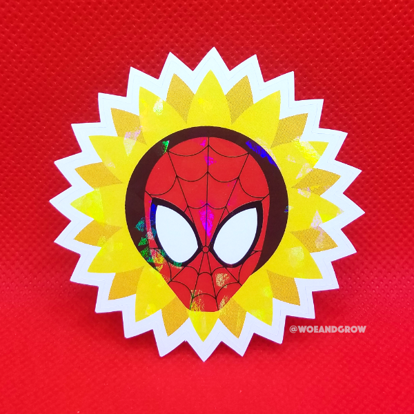 This holographic sticker features a sunflower design surrounding Peter B. Parker's Spider-Man inspired by Spiderman: Into the Spiderverse and its signature song, "Sunflower." The holographic design gives it a beautiful rainbow-like shine when viewed at different angles.