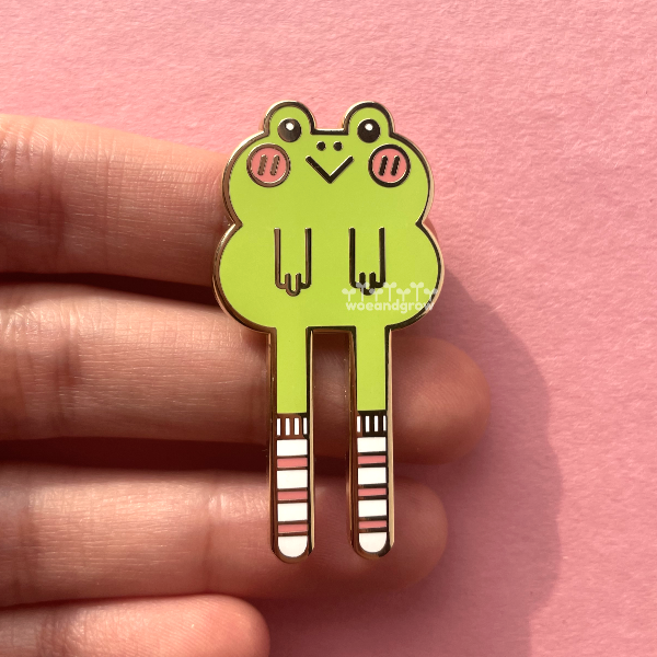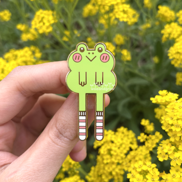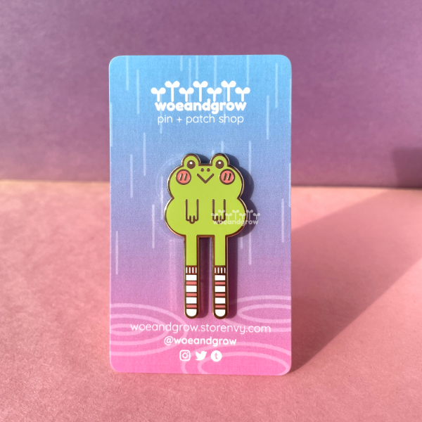 This adorable fashionable green froggie pin was originally part of the 'Frogs with Socks' enamel pin collection on Kickstarter. Enjoy your very own froggie friend sporting striped socks and a calm smile.