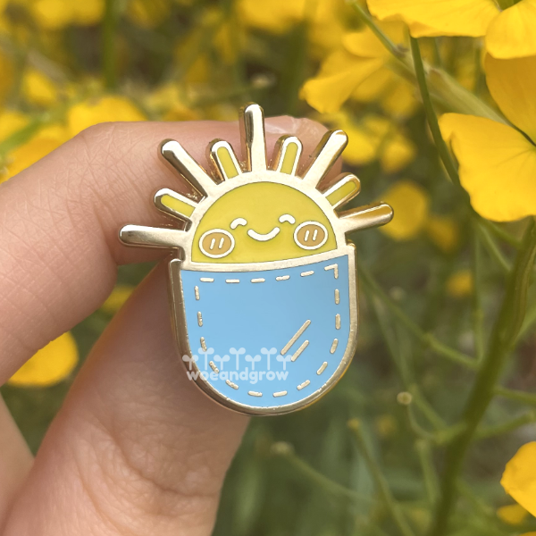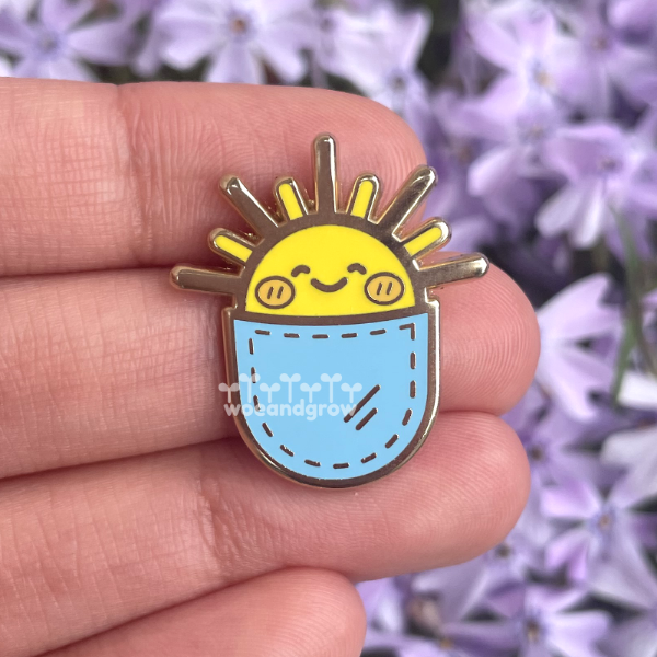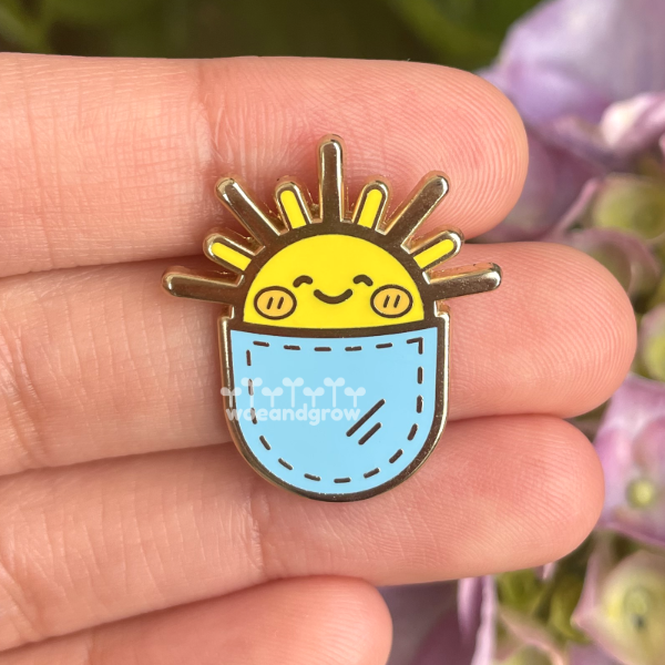 This hard enamel pin features a smiling little sun popping out of a pocket and spreading its joy with the world. Carry your own pocketful of sunshine wherever you go!
