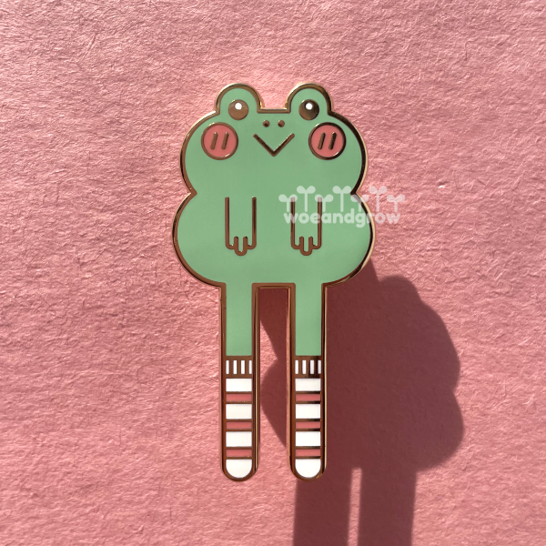 This adorable fashionable mint froggie pin was originally part of the 'Frogs with Socks' enamel pin collection on Kickstarter. Enjoy your very own froggie friend sporting striped socks and a calm smile.