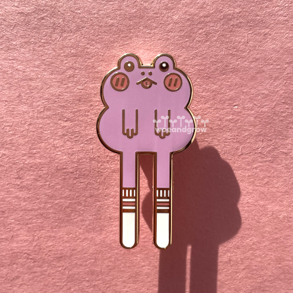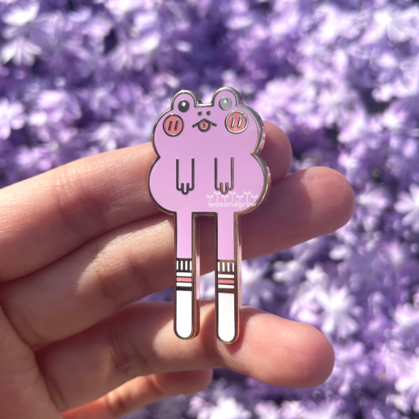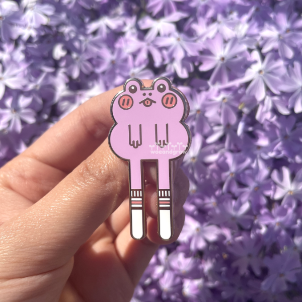 This adorable fashionable purple froggie pin was originally part of the 'Frogs with Socks' enamel pin collection on Kickstarter. Enjoy your very own froggie friend sporting tube socks and a blepping expression.