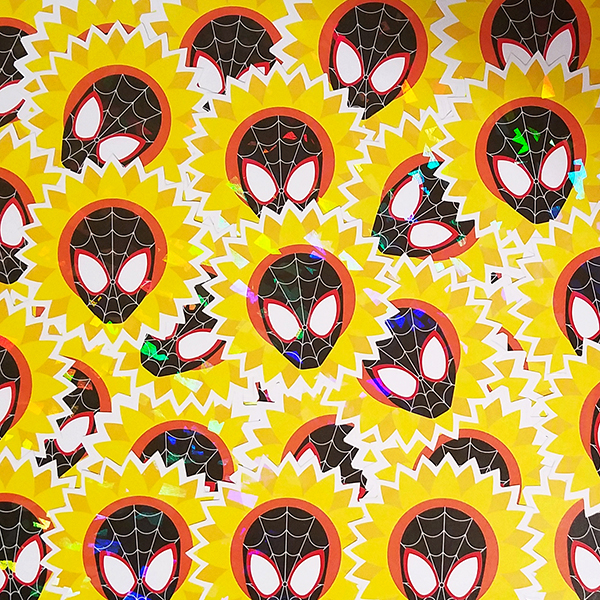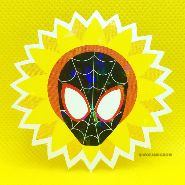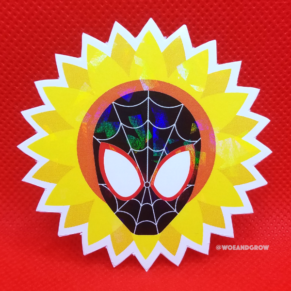 This holographic sticker features a sunflower design surrounding Miles Morales's Spider-Man inspired by Spiderman: Into the Spiderverse and its signature song, "Sunflower." The holographic design gives it a beautiful rainbow-like shine when viewed at different angles.