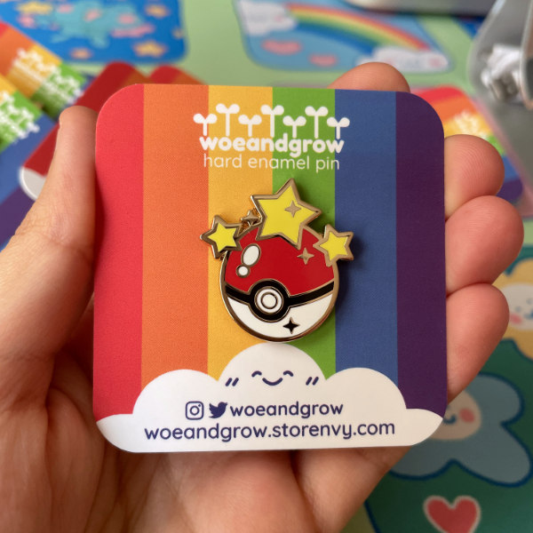 Gotcha! This hard enamel pin captures the satisfying moment of a successful catch, complete with stars and sparkles emanating from the classic Pokeball!