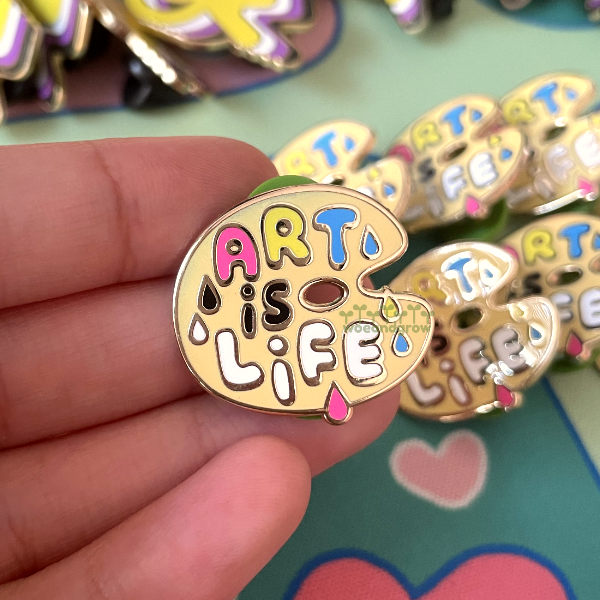 This hard enamel pin features a painter's palette with paint spelling out "Art is Life" in CMYK colors! Inspired by the deep passion and joy for creating art.