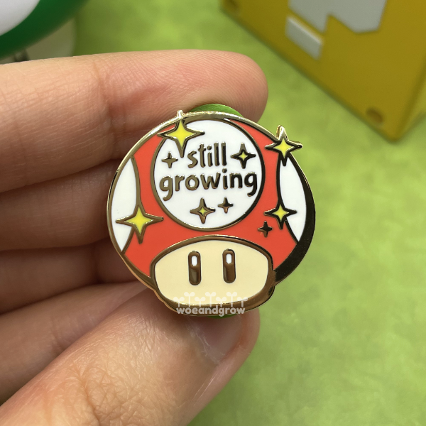 Feel empowered by this hard enamel pin inspired by Super Mario Bros. featuring the iconic super mushroom power-up! In the center spot is the matching message: "still growing". This pin is part of a collection of power-ups with inspiring messages!